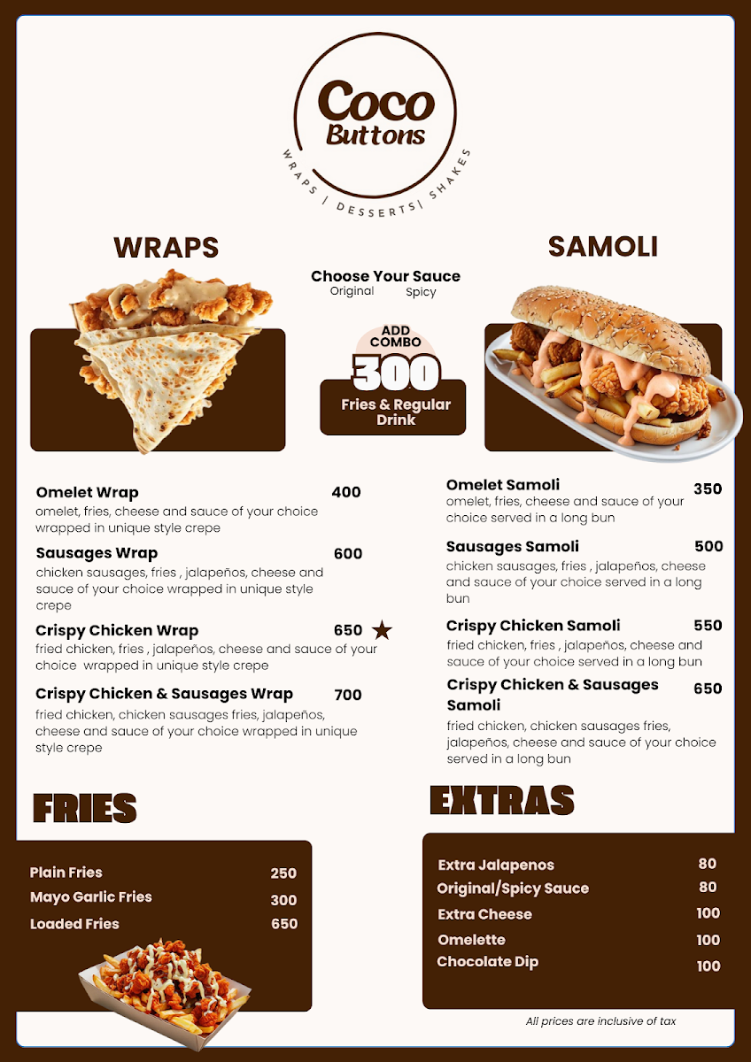 Coco Buttons specializes in a delightful fusion of fast food and sweet treats, providing a menu that satisfies both savory and sweet cravings. Their signature Samoli features succulent fried chicken paired with perfectly seasoned fries, spicy jalapeños, creamy cheese, and your choice of sauce all nestled in a long bun for a satisfying bite at just PKR 750. For those looking to indulge further, the 'Make It A Meal' option adds crispy chicken sausages and a refreshing soft drink for only PKR 1,100.
